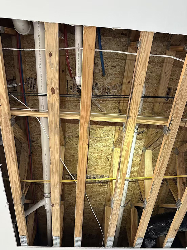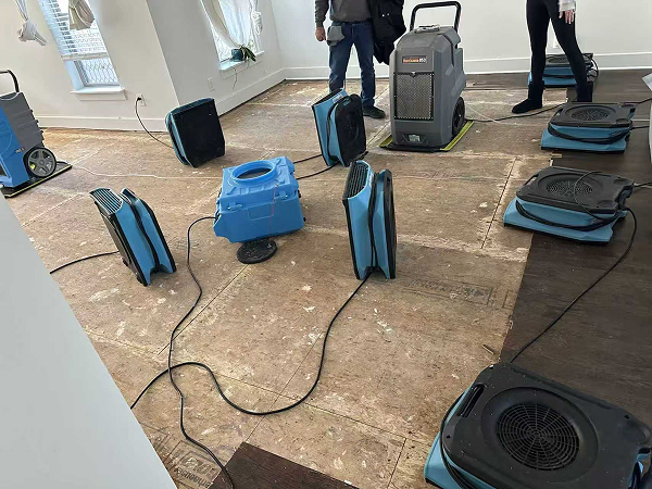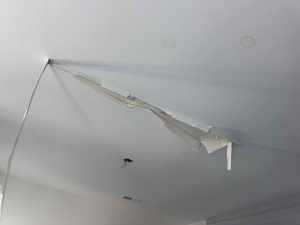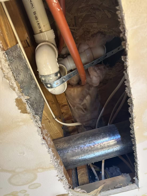 When we arrived, a water restoration company was already on site. The ceiling had been cut open, and more than a dozen dehumidifiers were running.