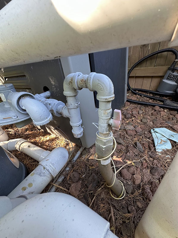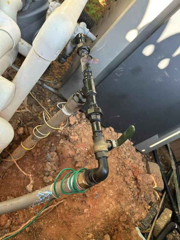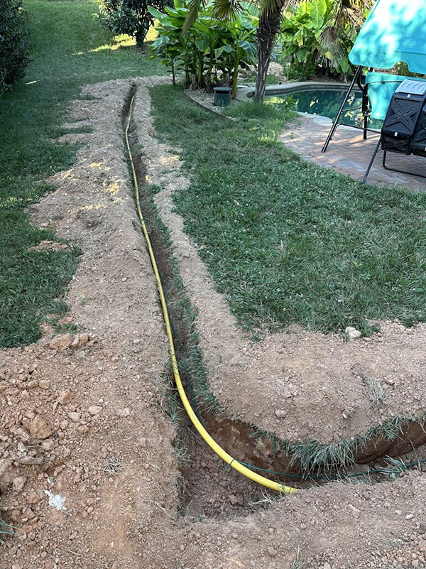 Near the pool, we found an existing gas line that serves the pool equipment. We branched a new line from this existing gas line to the kitchen, which significantly shortened the route. The pipe size is 3/4 inch, which meets code requirements.