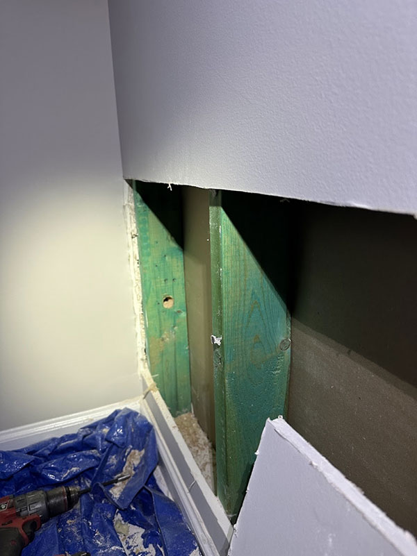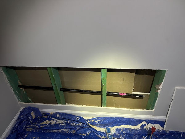 把厨房背面drywall打开,在stud上钻孔,安装gas black iron 黑铁管,并固定在stud上,重新盖上drywall板