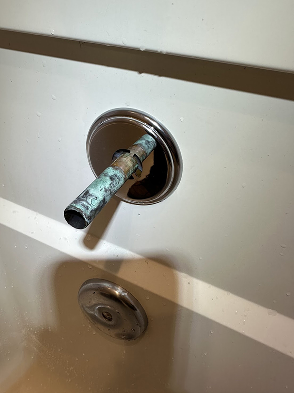 After removing the old spout, we discovered that the opening behind it was not properly sealed. Once the spout failed, water was able to flow directly into the wall cavity during shower use.